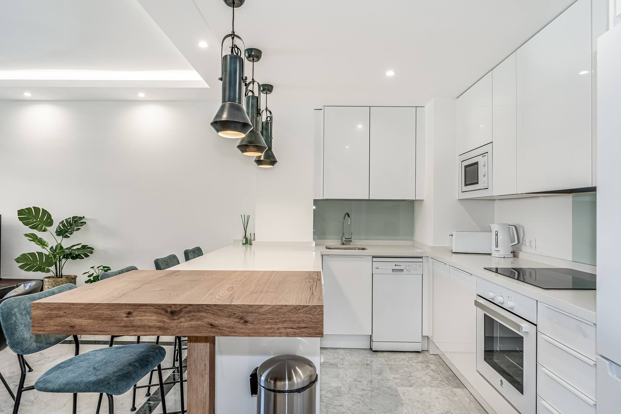Adéntrate en una cocina americana completamente equipada con electrodomésticos de alta calidad, incluyendo una placa de inducción, frigorífico, congelador, lavavajillas, horno, microondas, cafetera y todo el menaje necesario. La zona de comedor ofrece un lugar perfecto para compartir comidas y conversaciones.