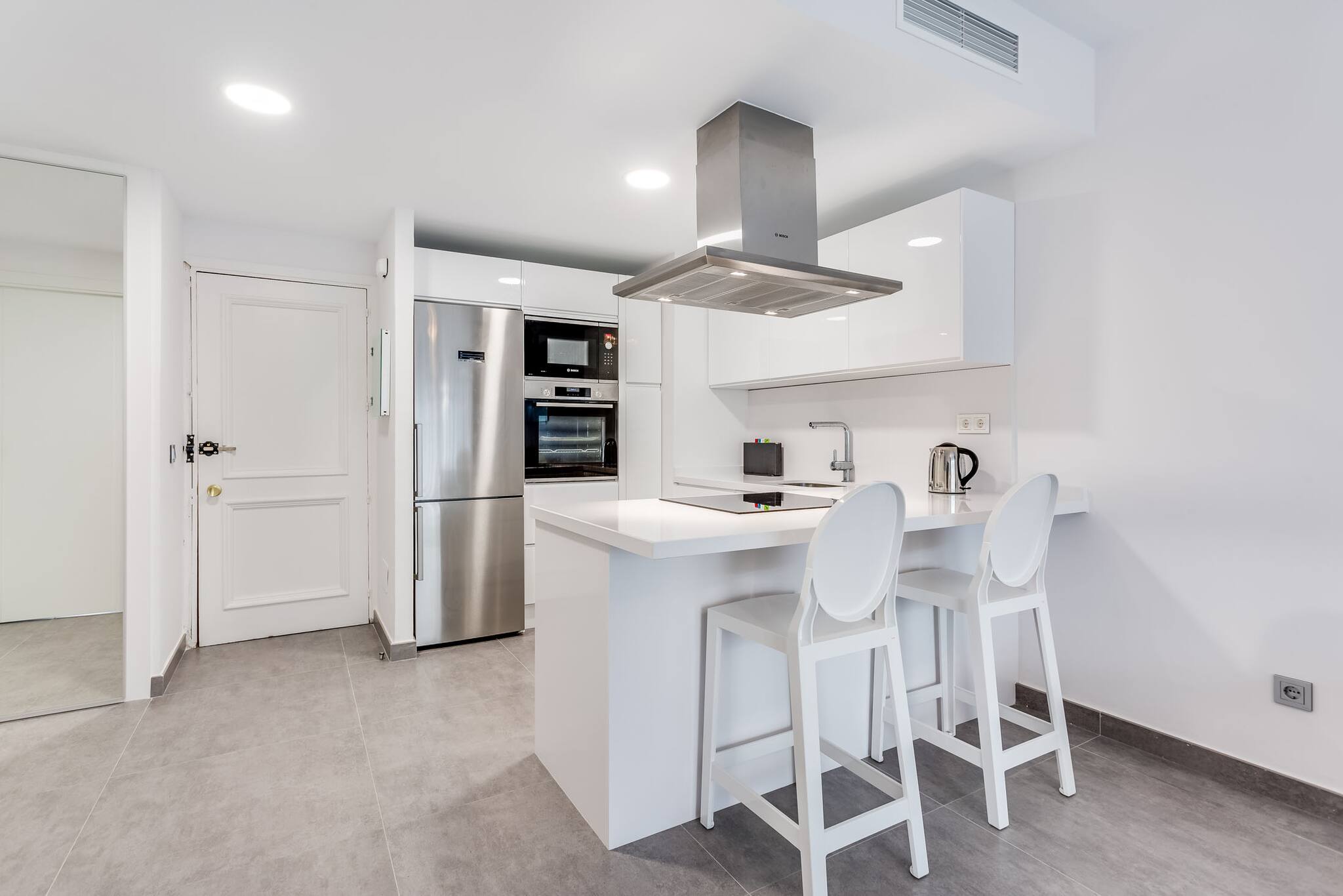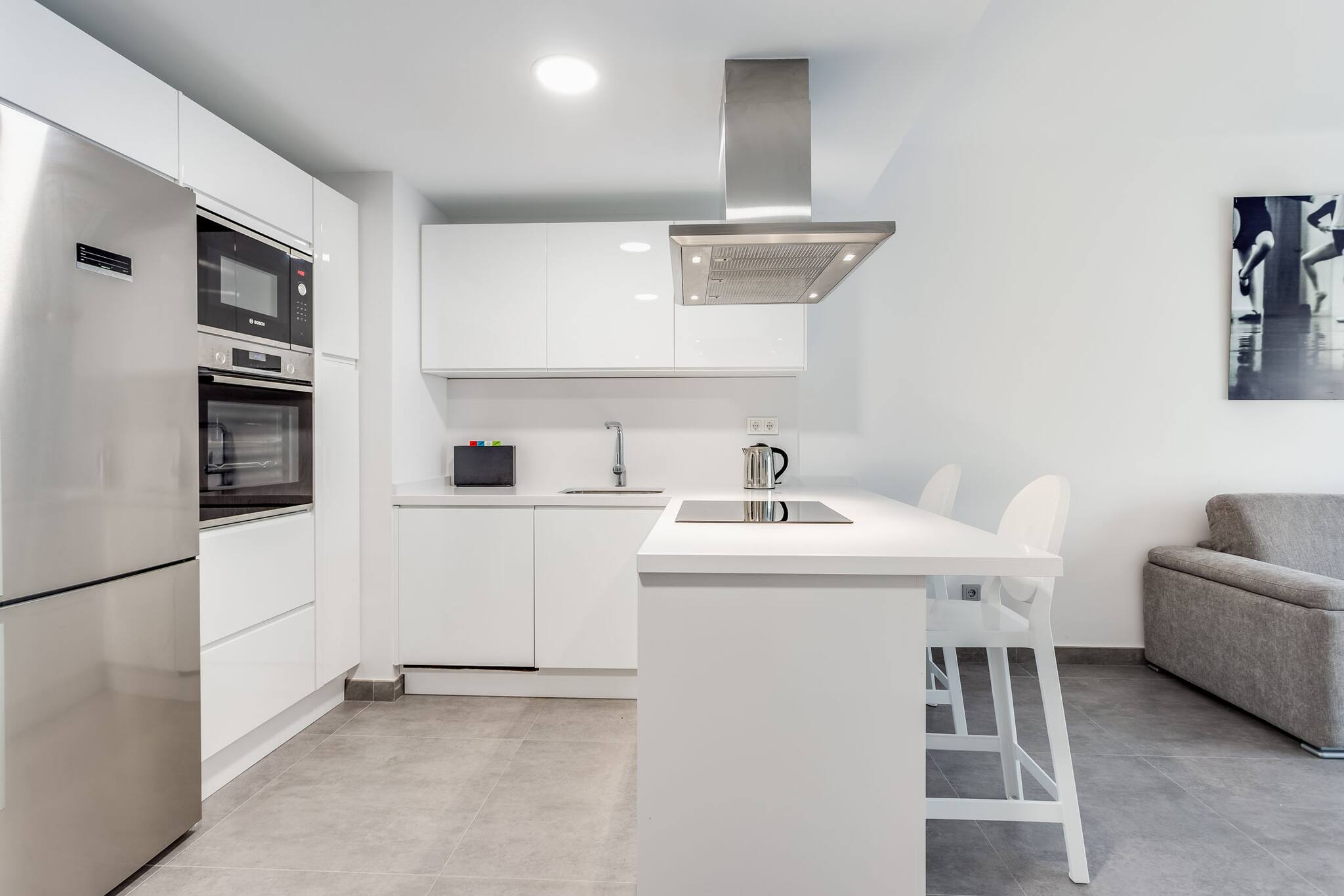 La cuisine américaine, à induction, est équipée avec réfrigérateur, micro-ondes, four, congélateur, lave-vaisselle, vaisselle/couverts, ustensiles/cuisine, cafetière, grille pain, bouilloire et cuisinière.