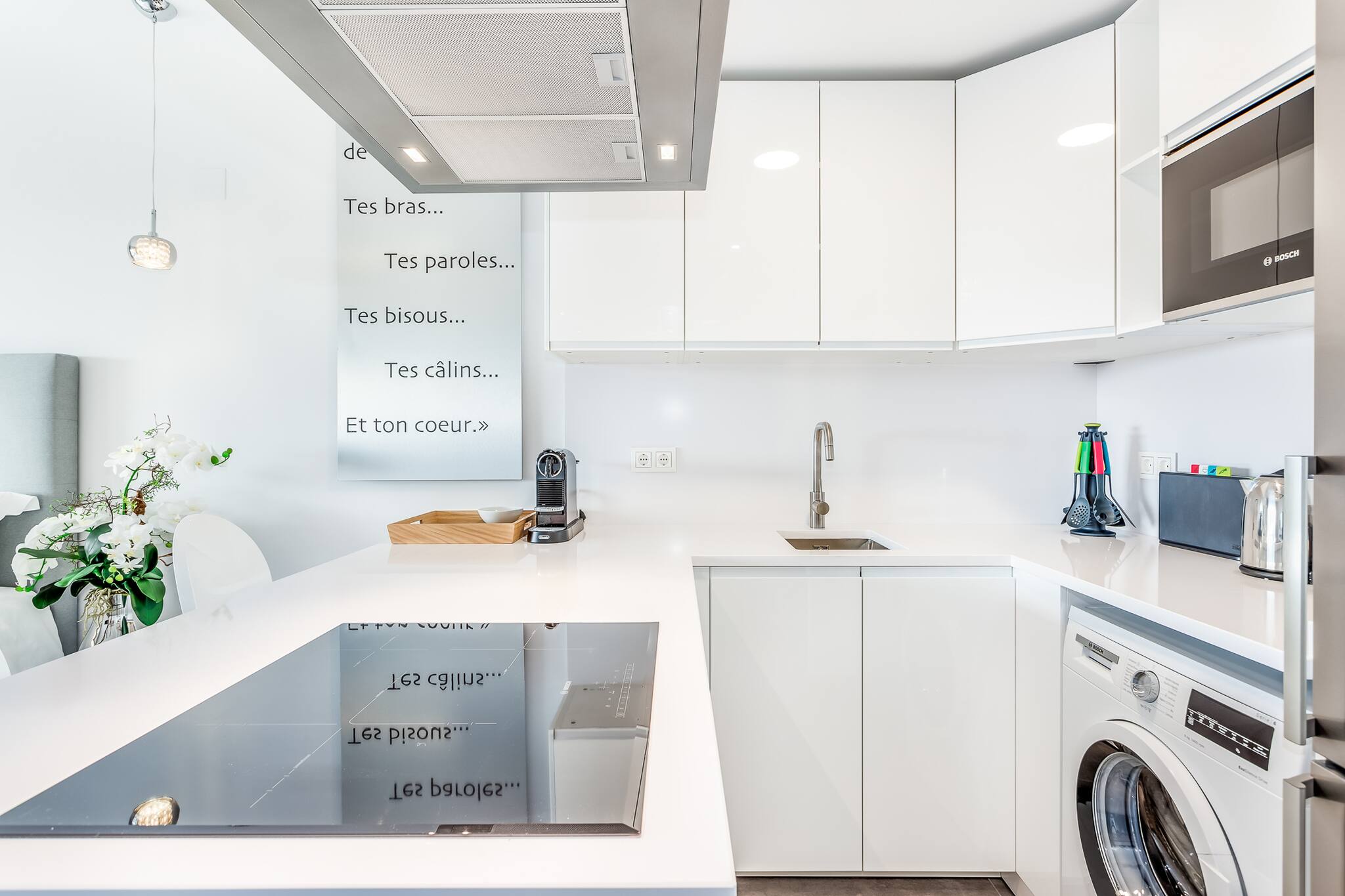 La cuisine américaine, à induction, est équipée avec réfrigérateur, micro-ondes, congélateur, vaisselle/couverts, ustensiles/cuisine, cafetière, grille pain, bouilloire et cuisinière.
